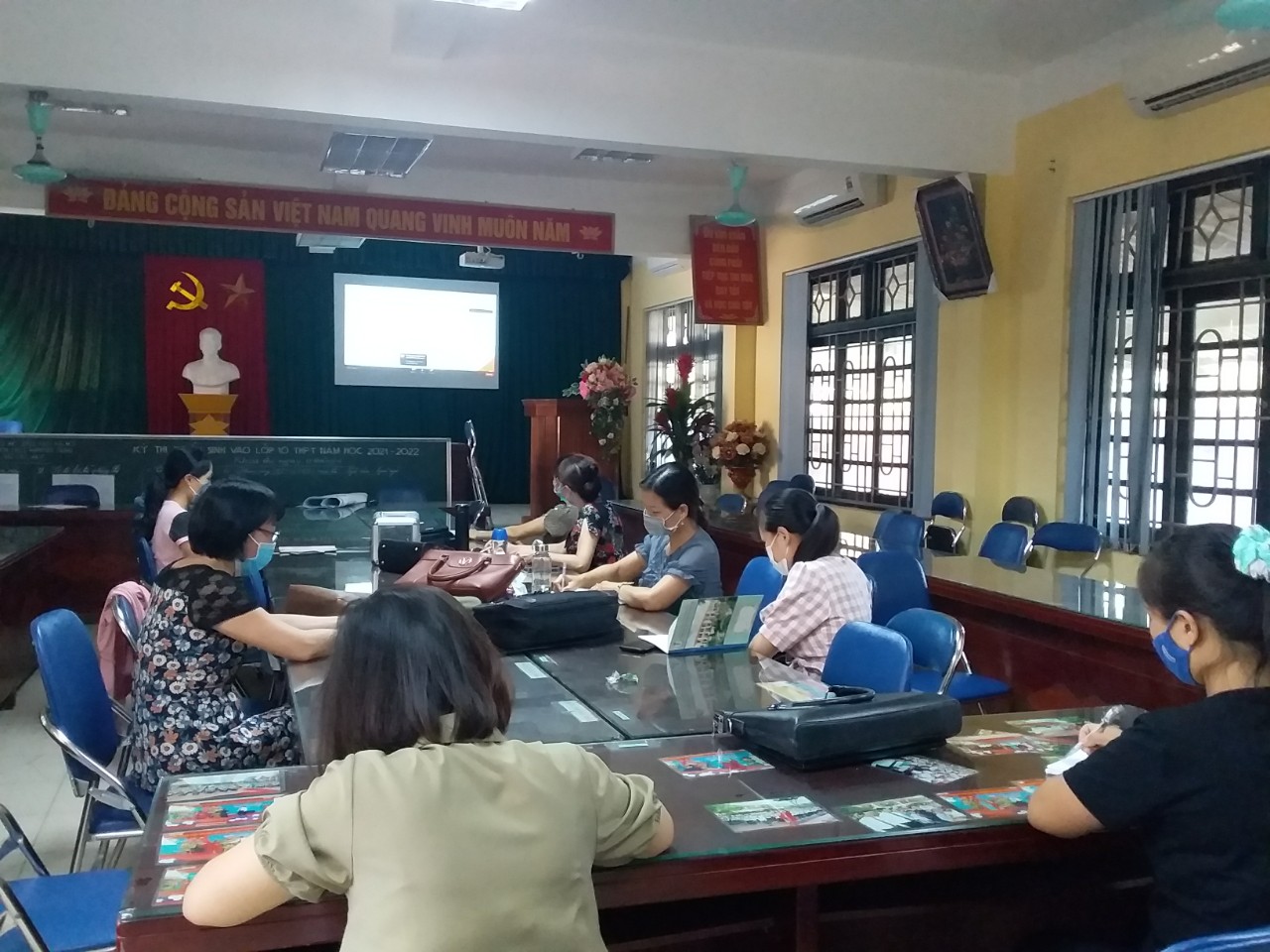 Để chuẩn bị công tác bồi dưỡng được tiến hành tốt và thực hiện "5K" phòng chống dịch bệnh Covid-19, nhà trường đã cho tiến hành kiểm tra đường truyền mạng, chuẩn bị các phòng học đầy đủ để phân nhóm môn học nhằm thực hiện giãn cách theo quy định.