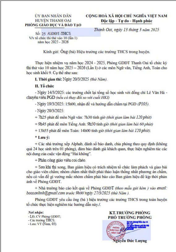 V/v tổ chức thi thử vào 10 THPT (lần 1) năm học 2025-2026