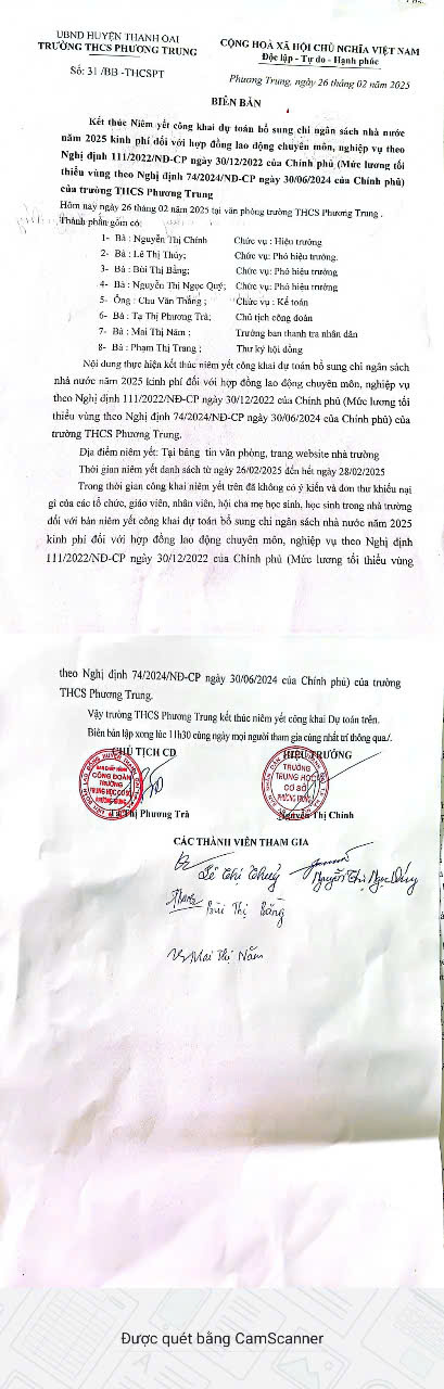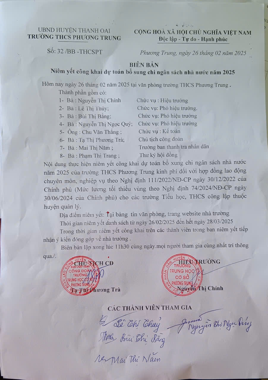 Biên bản niêm yết công khai dự toán bổ sung chi NSNN năm 2025 của Trường THCS Phương Trung